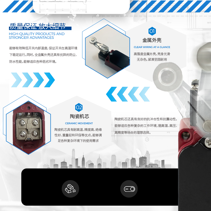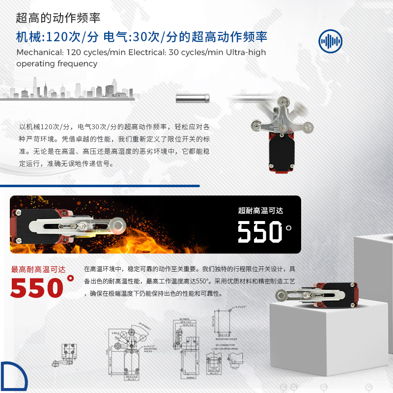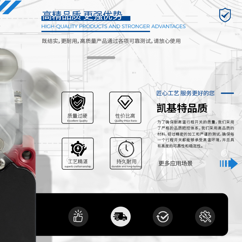 凱基特耐高溫行程開關具有以下優(yōu)點:超位報警,安全可靠,接觸檢測,磨損小。耐高溫最高可達550℃。鋁合金外殼 高機械強度,防護等級IP67 耐油、防水和防壓結構。
